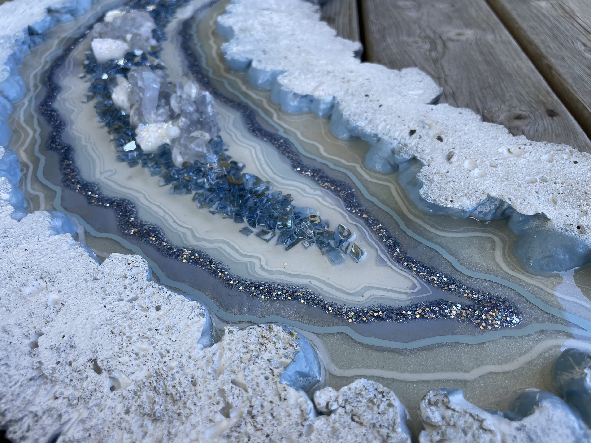 Mixed Media with Resin, Quartz Points, Angel Aura Quartz, Celestite, Small Tumbled Moonstone